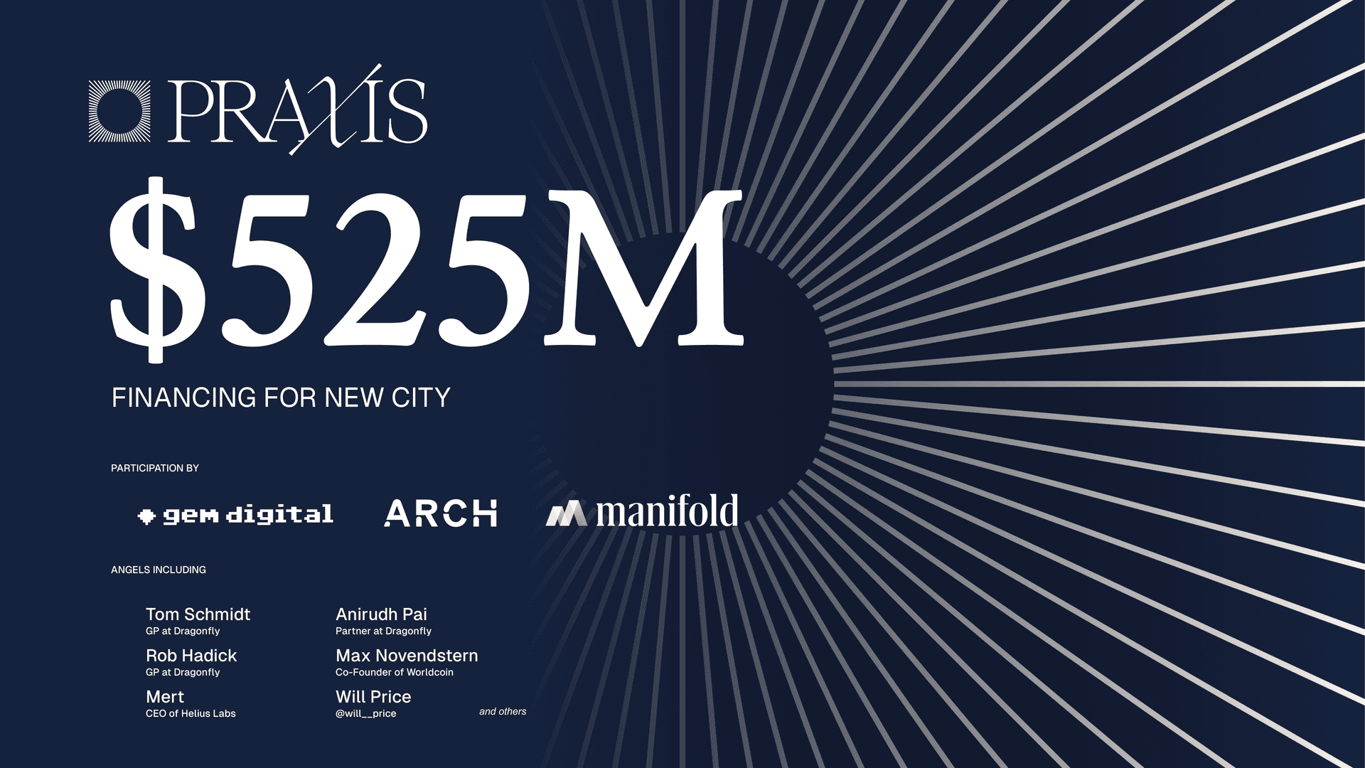 Today, we are pleased to announce a $525M financing to build the next great city, with new participants including Arch Lending, GEM Digital, Manifold Trading, and more, as well as new angels including Tom Schmidt (GP at Dragonfly), Rob Hadick (GP at Dragonfly), Anirudh Pai (Partner at Dragonfly), Mert (CEO of Helius Labs), Max Novendstern (Co-Founder of Worldcoin), Will Price, and more.